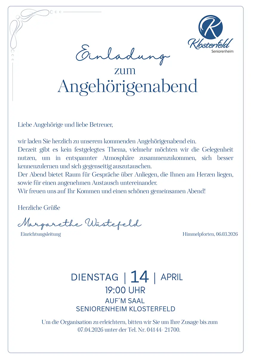 Das Seniorenheim Klosterfeld im Geestort Himmelpforten hinter Stade ist eine Pflegeeinrichtung der neuesten Generation: modern und baulich ansprechend wird das bisher klassisch betriebene Modell des Seniorenheims Klosterfeld seit 2016 nach dem stationären Hausgemeinschaftsprinzip betrieben. Wir erbringen unsere Dienstleistungen unter Beachtung der Wertschätzung und Selbstbestimmtheit all der uns anvertrauten Menschen. Die Bedürfnisse und Erwartungen werden im Gespräch mit unseren Bewohnern ermittelt und daran unsere Dienstleistung ausgerichtet. Kommen Sie doch mal vorbei und überzeugen Sie sich von unserem Angebot! Wer nicht mehr warten kann, guckt sich nun einfach unsere Homepage näher an, oder besucht uns in den sozialen Medien.